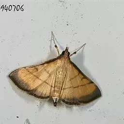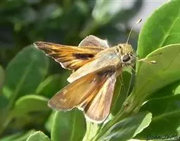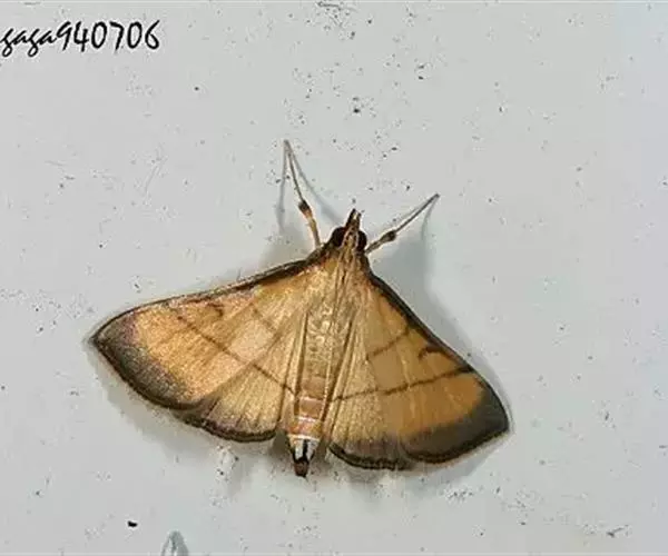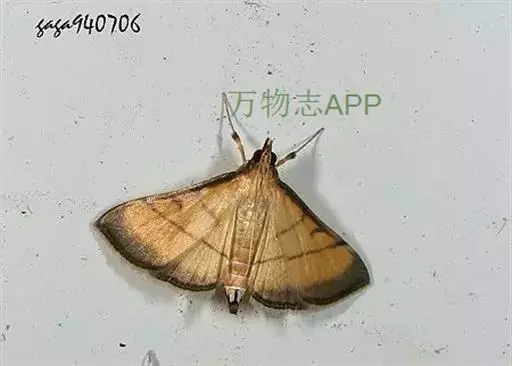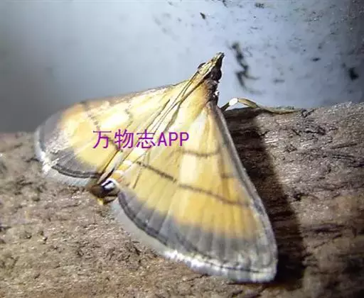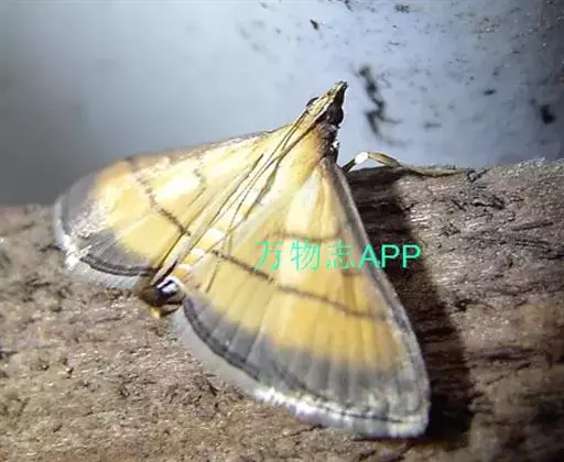 稻纵卷叶螟成虫图 成虫 成虫体长7~9毫米,翅展12~18毫米。体、翅黄褐色,停息时两翅斜展在背部两侧。复眼黑色,触角丝状,黄白色。前翅近三角形,前缘暗褐色,翅面上有内、中、外三条暗褐色横线,内、外横线从翅的前缘延至后缘,中横线短而略粗,外缘有一条暗褐色宽带,外缘线黑褐色。后翅有内、外横线二条,内横线短,不达后缘,外横线及外缘宽带与前翅相同,直达后缘。腹部各节后缘有暗褐色及白色横线各一条,腹部末节有二个并列的白色直条斑。雄蛾前翅前缘中部稍内方,有一中间凹陷周围黑色毛簇的闪光“眼点·,中横线与鼻眼点,相连;前足跗节膨大,上有褐色丛毛,停息时尾节常向上翘起。雌蛾前翅前缘中间,即中横线处无。眼点",前足咐节上无丛毛,停息时,尾部较平直。