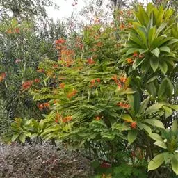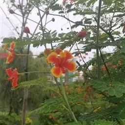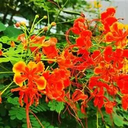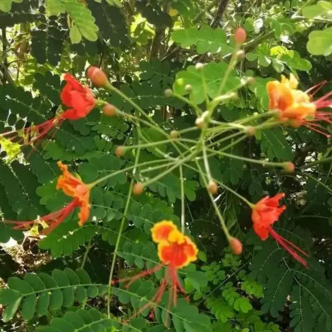 洋金凤 Sw.),豆科小凤花属灌木状或小乔木植物,枝无毛,绿或粉绿色;二回羽状复叶;总状花序伞房状,…