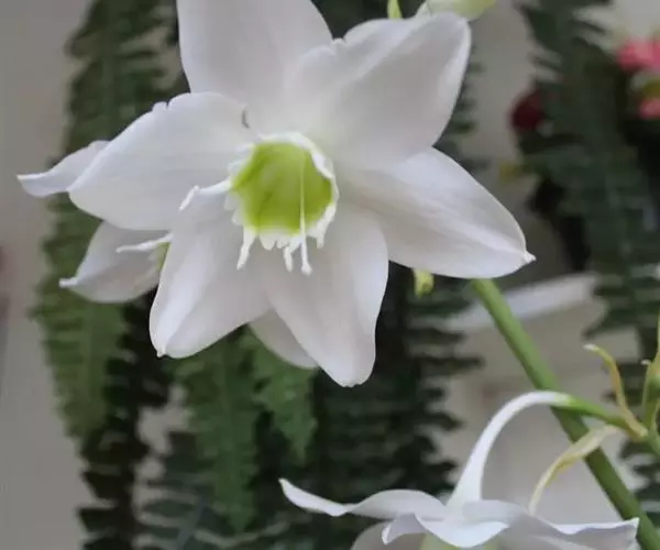 南美水仙是一种宜于室内莳养的观叶观花鳞茎花卉。宽大的带状叶片飘逸豪放,花朵硕大,洁白无瑕,清香四溢,一年多次开花。可装点庭院,绿化阳台,美化室内环境,是一种应用范围很广的花卉。