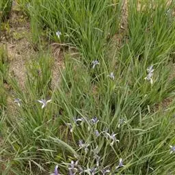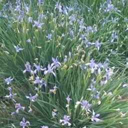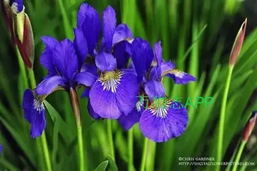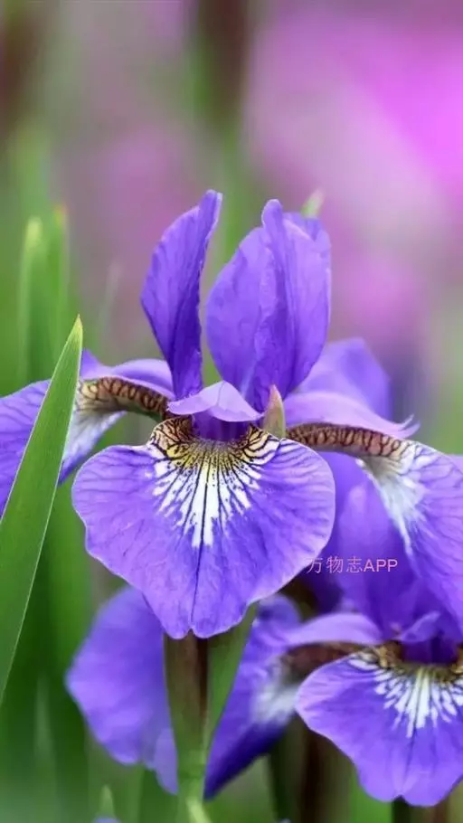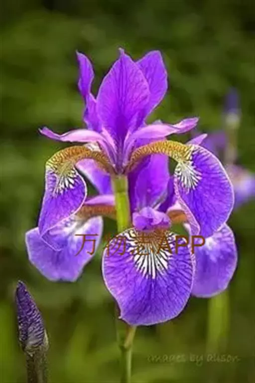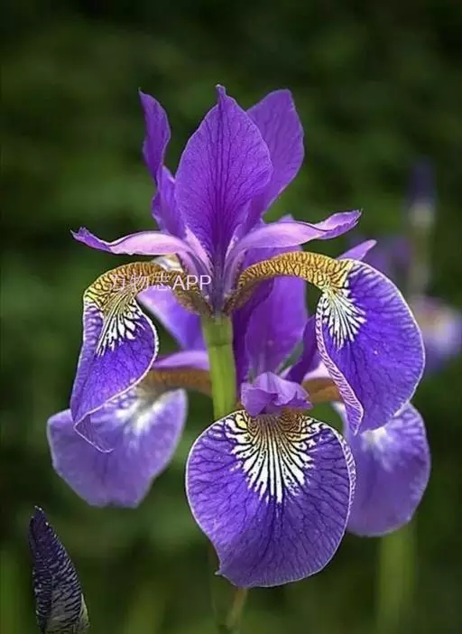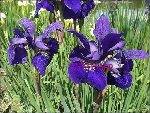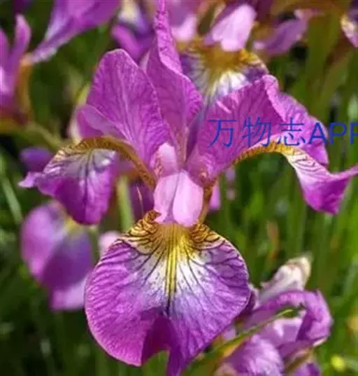 西伯利亚鸢尾(学名:Iris sibirica L.):多年生草本植物,植株基部围有鞘状叶及老叶残留的纤维。根状茎粗壮,斜伸;须根黄白色,绳索状,有皱缩的横纹。叶灰绿色,条形,顶端渐尖。花茎高于叶片,平滑,高40-60厘米,有1-2枚茎生叶;苞片3枚,膜质,绿色,边缘略带红紫色,狭卵形或披针形,顶端短渐尖,内包含有2朵花。花蓝紫色;外花被裂片倒卵形,上部反折下垂,内花被裂片狭椭圆形或倒披针形,直立。蒴果卵状圆柱形、长圆柱形或椭圆状柱形,无喙。花期4-5月,果期6-7月。