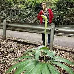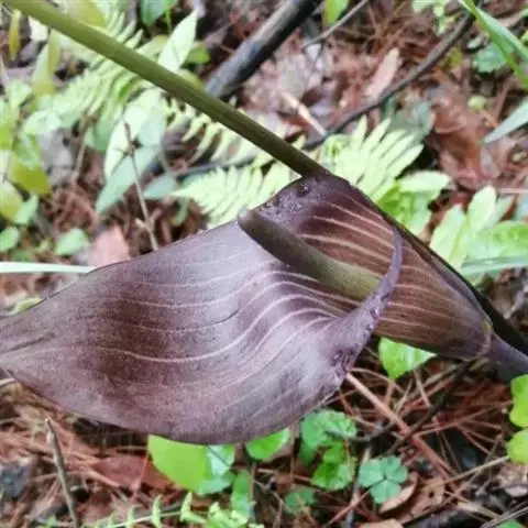 象头花又名:象鼻花、三步莲。块茎扁球形,直径1-6厘米或更大,颈部生多数圆柱状肉质根,周围有多数直径1-2厘米的小球茎,均肉红色(故有红半夏、红南星之称),小球茎逐渐与母体分离,然后萌发为独立的植株。鳞叶2-3,披针形,膜质,最内的长13-20厘米,淡褐色,带紫色斑润,包围叶柄及花序柄,上部分离。叶1,叶柄长20-50厘米,肉红色,基部粗可达1-2厘米,下部1/4-1/5鞘状。幼株叶片轮廓心状箭形,全缘,腰部稍狭缩,两侧基部近圆形。成年植株叶片绿色,背淡,近革质,3全裂,裂片无柄或近无柄,中裂片卵形,宽椭圆形或近倒卵形,基部短楔形至近截形,骤狭渐尖,长7-23厘米,宽6-22厘米;侧裂片偏斜,椭圆形,外侧宽几为内侧的2倍,比中裂片小,基部楔形,长6-20厘米,宽5-19厘米,均全缘,侧脉5-10对,集合脉距边缘3-6毫米,有明显的网脉。花序柄短于叶柄,长10-0厘米,粗3-6毫米,肉红色,花期直立,果期下弯180度。佛焰苞污紫色、深紫色,具白色或绿白色宽条纹(宽1.5毫米),管部长4-6厘米,圆筒形,粗1.2-2厘米,喉部边缘反卷约1毫米;檐部下弯成盔状,长4.5-11厘米,渐尖,有长1-2厘米或5-6厘米以上的线形尾尖,下垂。肉穗花序单性,雄花序紫色,长圆锥形,长1.5-4厘米,粗2.5-6毫米,花疏,雄花具粗短的柄,花药2-5,药室球形,顶孔开裂,附属器绿紫色,伸长的圆锥状,长3.5-6厘米,基部粗4-8毫米,向下渐狭成短柄,上部粗约1毫米,由中部以下开始下弯,有时几弯成圆圈,稀近直立。雌花序圆柱形,长1.2-3.8厘米,粗0.8-2厘米,花密,子房绿紫色,顶部扁平,近五角形,下部棱状楔形,长5毫米,柱头明显凸起,胚珠2,近纺锤形,白色,珠柄短,直立。浆果绿色,干时黄褐色,倒圆锥形,长达1.2厘米,粗5毫米,种子1-2,倒卵形或卵形,种皮淡褐色,骨质,表面泡沫状。花期5-7月,果9-10月成熟。