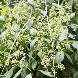 圆锥聚伞花序较窄小,长5-7厘米,宽3-4厘米,通常有3-5分枝,花序、分枝及小花梗均被锈色毛,花序梗长1-2厘米,小花梗细长达4毫米;花白色,直径4-5毫米;萼片先端急尖;花瓣长方卵形,边缘微蚀;花盘略5裂;雄蕊插生花盘外缘,花丝长达3毫米;子房具3棱,花柱柱状,柱头稍膨大,3裂。