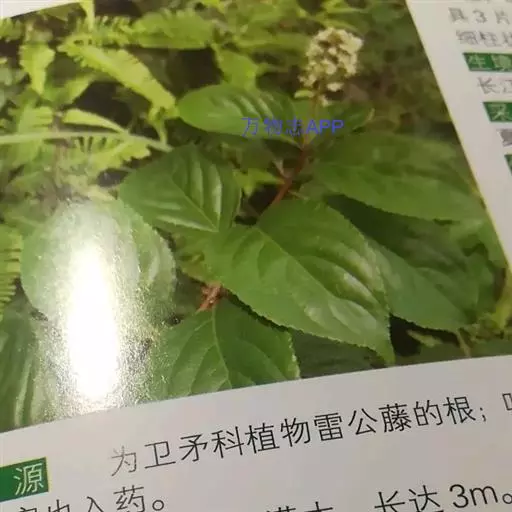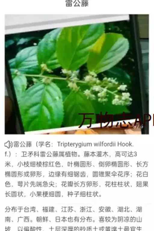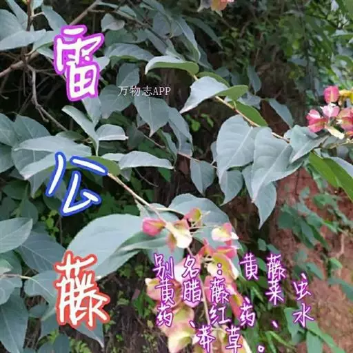 雷公藤 藤本灌木,高1-3米,小枝棕红色,具有4-6根细棱,被密毛及细密皮孔。叶椭圆形、倒卵椭圆形、长方椭圆形或卵形,长4-7.5厘米,宽3-4厘米,先端急尖或短渐尖,基部阔楔形或圆形,边缘有细锯齿,侧脉4-7对,达叶缘后稍上弯;叶柄长5-8毫米,密被锈色毛。