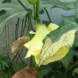 咖啡黄葵(学名:Abelmoschus esculentus (Linn.)Moench)亦称黄秋葵,锦葵科一年生草本植物。茎圆柱形,疏生散刺。叶掌状,裂片阔至狭,托叶线形,被疏硬毛。花单生于叶腋间,花梗疏被糙硬毛,小苞片钟形;花萼钟形,密被星状短绒毛;花黄色,内面基部紫色,蒴果筒状尖塔形,种子球形,具毛脉纹。花期5-9月。