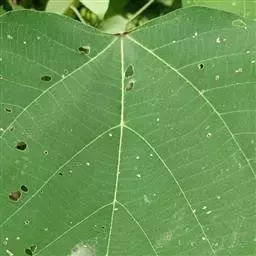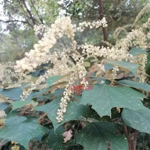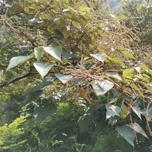 白楸属於大戟科野桐属,是生小乔木,成长时可高达5米。叶片大多为卵形,基部两个腺点分泌含糖的液体,吸引小昆虫舔食。叶面深绿色,背面则呈白色,每逢山风吹拂,叶片翻动,林海彷佛掀起滚滚白浪。
