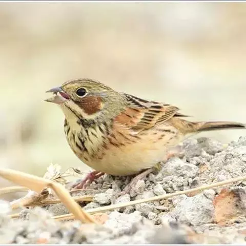 栗斑腹鹀:属小型鸣禽。体重19-25克,体长145-167毫米。头顶至背栗红色,眼先和颧纹黑褐色,…