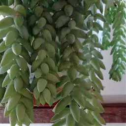 多年生草本植物株,叶尖尖的,型似“棒子”,生有气根,叶带有白色蜡粉,是灰蓝的,有种朦胧之美,叶在小枝上的排列似云杉,分叉多。像球松(小松绿)一样是直立的小型多肉植物,但没有球松健壮,两者同属同科。非常适合做庭院的地被。多年生草本,常年蓝绿色,非常的好养,植株叶片交互环生,容易长小侧芽,能够长成大串的一群,时间长了有枝干,枝干无法支撑强大的枝条基本会匍匐生长,簇状花序,花开黄色,异花授粉。