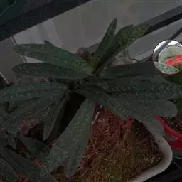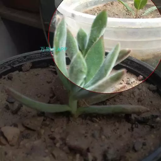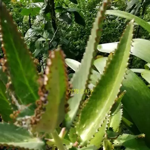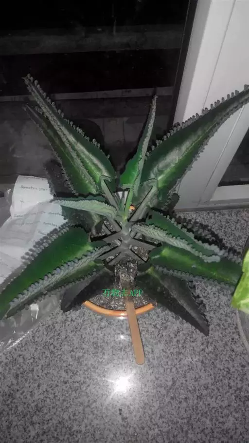 叶近簇生或稍二列(幼小植株),肥厚多汁,条状披针形,粉绿色,长15-35厘米,基部宽4-5厘米,顶端有几个小齿,边缘疏生刺状小齿。
