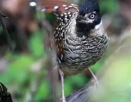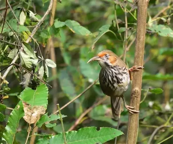 黑顶噪鹛:中型鸟类,体长24-26厘米。前额、脸、颏、喉黑色,头顶黑褐沾棕或深棕橄榄褐色,…