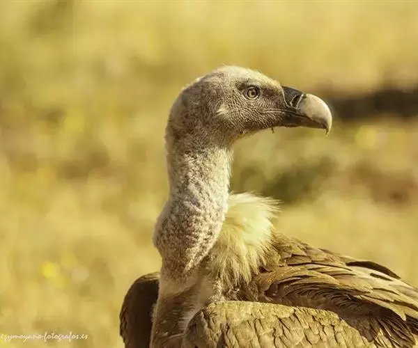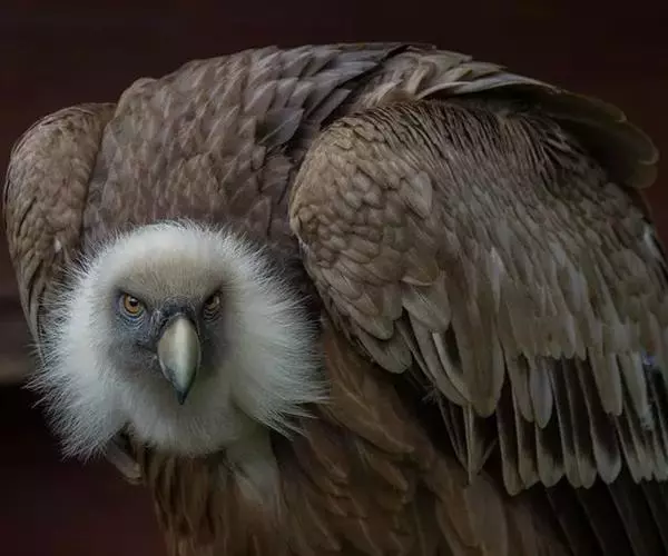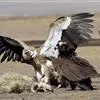 高山兀鹫头和颈上部被有污黄色像头发一样的羽毛,到下颈羽毛逐渐变白和变成绒羽,颈基部有长而呈披针形的簇羽形成领翎围绕在颈部,淡皮黄色或黄褐色,具有中央白色羽轴纹。背和翅上覆羽淡黄褐色,羽毛中央较褐,形成一些不规则的褐斑,外侧大覆羽、飞羽和尾羽暗褐色,内侧次级飞羽具淡色尖端。上胸为密的白色绒羽和被有淡褐色胸斑,其余下体淡皮黄褐色,肛区和尾下覆羽全白色,具不清晰的羽轴纹。幼鸟头部褐色,绒羽较成鸟多。上体暗褐色,背、肩和翅上覆羽具粗著的黄白色纵纹,初级飞羽和尾羽黑褐色。下体暗褐色,具淡色羽轴纹。