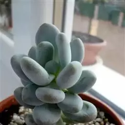 蓝黛莲是一种景天科厚叶草属植物。叶片呈略扁的圆柱形,排列成莲座状;颜色为灰绿色,…