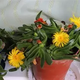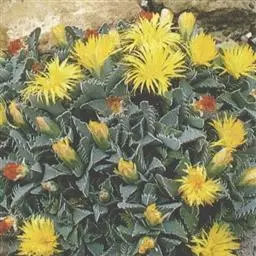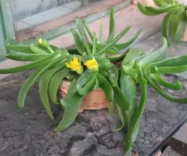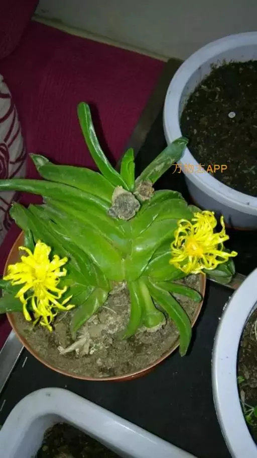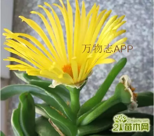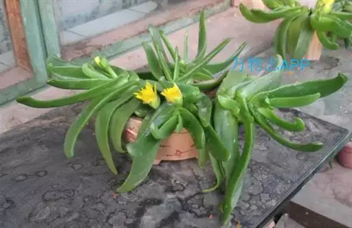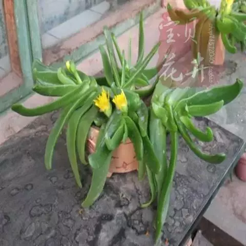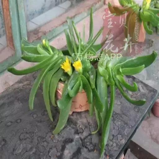 多年生,茎肉质,叉状分枝。叶片舌状或三角状线形,肥厚多肉,鲜绿色,交互对生,紧密排成2列,长约6厘米,宽约1.5厘米,顶端具钝弯钩,基部合生。花顶生,具细长梗,橙黄色,直径约2厘米;花瓣和雄蕊均多数;花托膨大。花期5-6月。