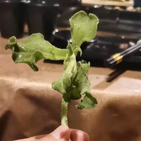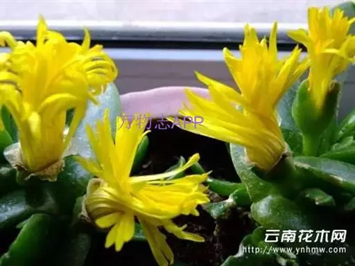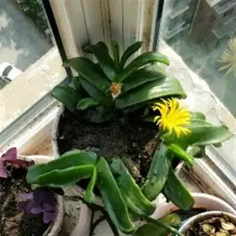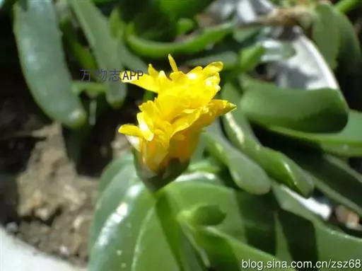 宝绿中文学名弯叶日中花,拉丁文名Mesembryanthemum uncatum Salm-Dyck,又名舌叶花、佛手掌。