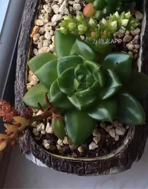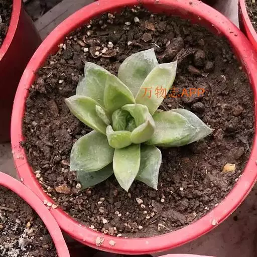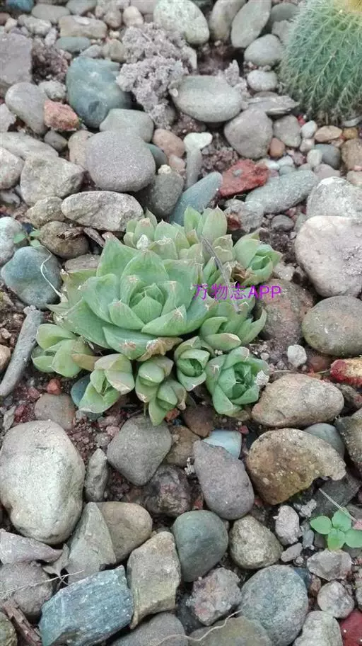 植株矮小,株高一般5~6厘米。叶片互生,长圆形或匙状,肉质肥厚,生于极短的茎上,紧密排列为莲座状,叶色翠绿色,叶肉呈半透明状,叶面有8~12条暗褐色条纹或中间有褐色、青色的斑块,叶缘粉红色,有细锯齿。顶生总状花序,花极小。是常见的多肉植物之一。