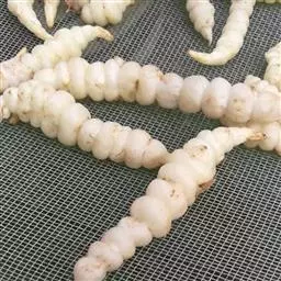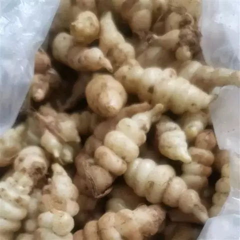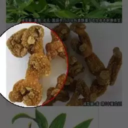 药材性状 根茎多成纺锤形,顶端有的呈螺旋状,两头略尖,长1.5-4cm,直径3-7mm。表面棕黄色,多皱缩,扭曲,具5-15个环节,节间课件点状芽痕及根痕。质坚脆,易折断,断面平坦,白色。气微,味微甘。用水浸泡后易膨胀,节结明显。