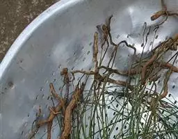 全草皱缩成团,伸展后长5-30cm。主根扁圆柱形,长3-5cm,直径1-1.5(-3)mm;表面棕黄色或黄白色,较粗糙,有纵沟及皱纹,常呈二股扭曲状,有支根和须根;质较硬,易折断,断 面平坦,黄白色,中心棕色。