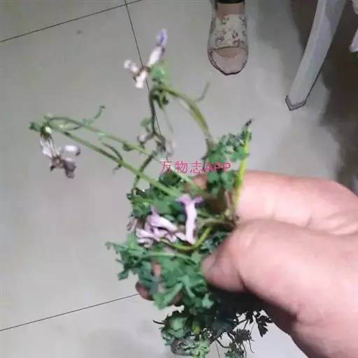 叶多皱缩破碎,暗绿色或灰绿色,有长柄;叶片二至三回羽状全裂,裂片纤细;柔软。花淡紫色,少见或已皱缩破碎。