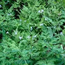 等距地生叶。下部叶在开花时枯萎,茎中部叶有稍长柄;叶片五角状肾形,长约7厘米,宽约10厘米,三深裂至距基部3-5毫米处,中深裂片宽菱形,短渐尖,三深裂,二回裂片有少数狭三角形小裂片,锐尖,侧深裂片扇形,不等二深裂,两面散生少数短柔毛;叶柄与叶片近等长,疏被短柔毛。