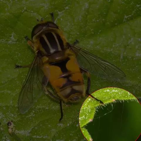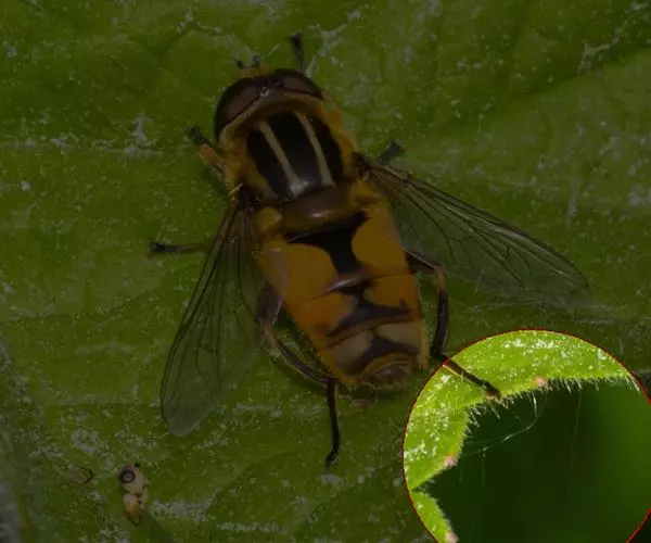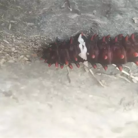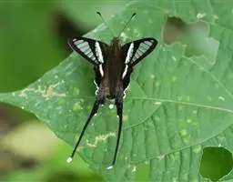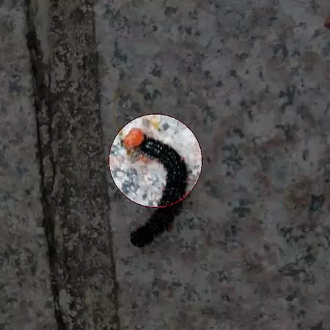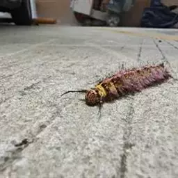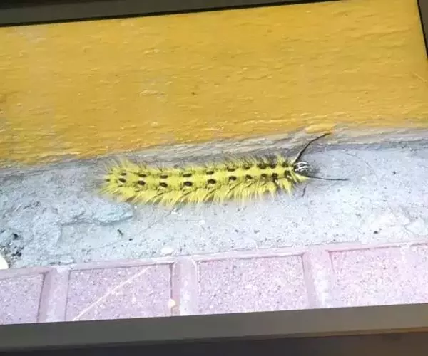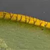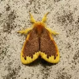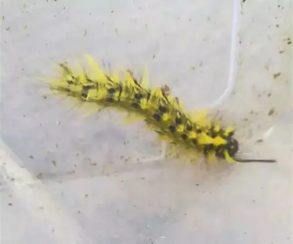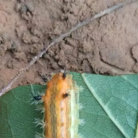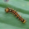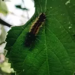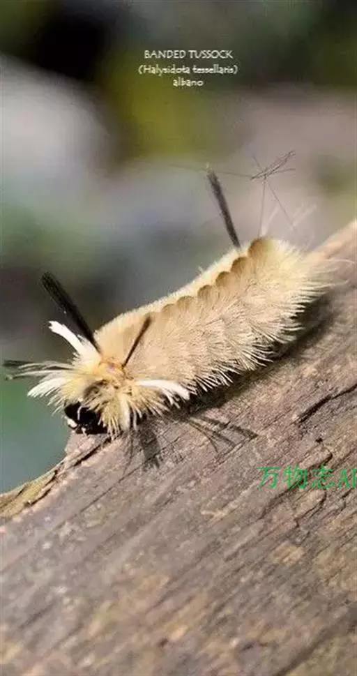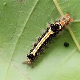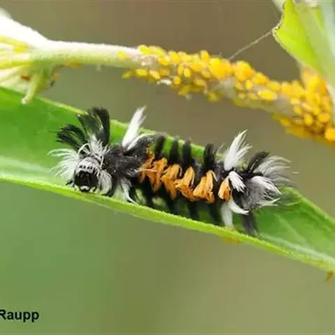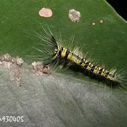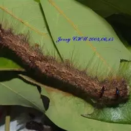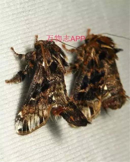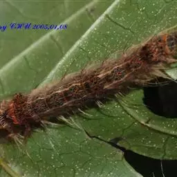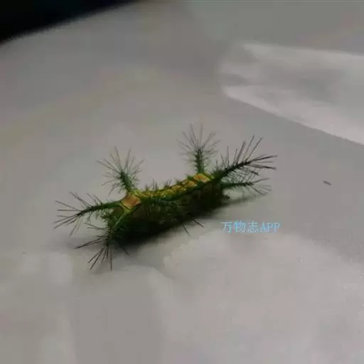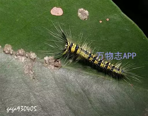 幼虫 体长25~40mm,第1、2腹节宽。头褐黑色,有光泽;体黑褐色,前胸背板黄色,具2条黑色纵线;体背面有一橙黄色带,在第1、2、8腹节中断,带中央贯穿一红褐间断的线;亚背线白色;气门下线红黄色;前胸背面两侧各有一向前突出的红色瘤,瘤上生黑色长毛束和自褐色短毛,其余各节背瘤黑色,生黑褐色长毛和白色羽状毛,第5、6腹节瘤橙红色,生有黑褐色长毛;腹部第1、2节背面各有1对愈合的黑色瘤,上生白色羽状毛和黑褐色长毛;第9腹节瘤橙色,上生黑褐色长毛。