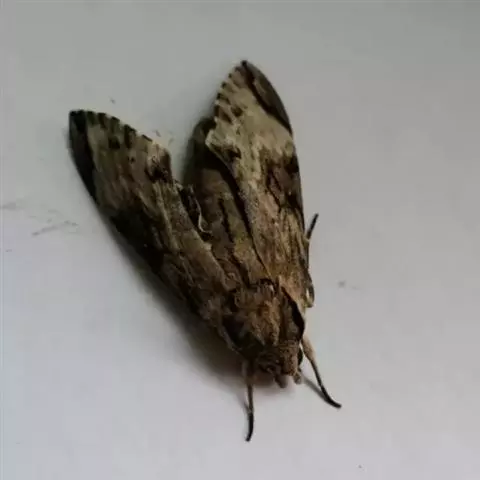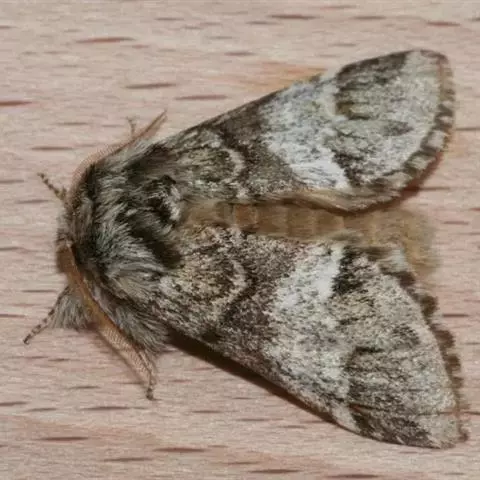 成虫雌体长18~20mm,雄体长14~16mm,翅展30~40mm。触角干白色,栉齿棕黄色;下唇须白色,外侧黑褐色;头、胸、腹部基半部和足白色微带黄色,腹部其余部分和脏毛簇黄色;前、后翅白色,前翅后缘有两个褐色斑,有的个体内侧褐色斑不明显;前、后翅反面白色,前翅前缘黑褐色。