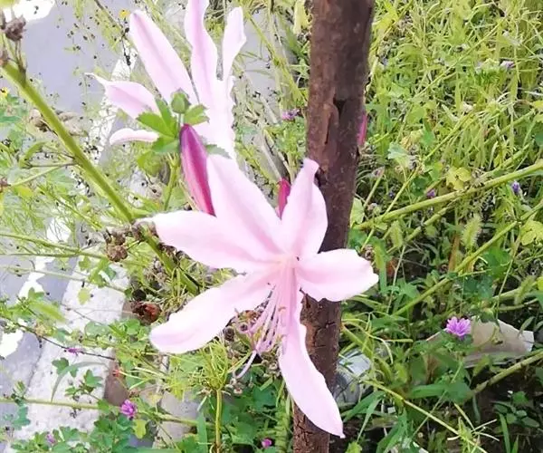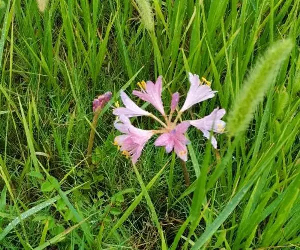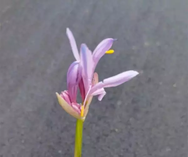 花茎高约60厘米;总苞片2枚,长约3.5厘米,宽约1.2厘米;伞形花序有花4-6朵;花淡紫红色,花被裂片顶端常带蓝色,倒披针形,长约4.5厘米,宽约1厘米,边缘不皱缩;花被筒长1-1.5厘米;雄蕊与花被近等长;花柱略伸出于花被外。花期8-9月。