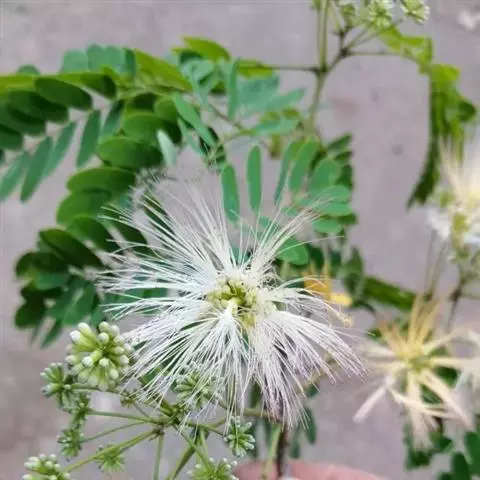 花:山槐的花头状花序2-7枚生于叶腋,或于枝顶排成圆锥花序。花初白色,后变黄,具明显的小花梗;花瞥管状,长2-3毫米,5齿裂。花冠长6-8毫米,中部以下连合呈管状,裂片披针形,花粤、花冠均密被长柔毛;雄蕊长2.5 -3.5厘米,基部连合呈管状。花期6-7月。
