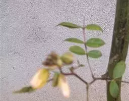 叶:山槐的叶二回羽状复叶,羽片2-4对、小叶5-14对,长圆形或长圆状卵形,长1.8 - 3.5厘米,宽7-17毫米,先端圆钝而有细尖头,基部不等侧,两面均被短柔毛,中脉稍偏于上侧。