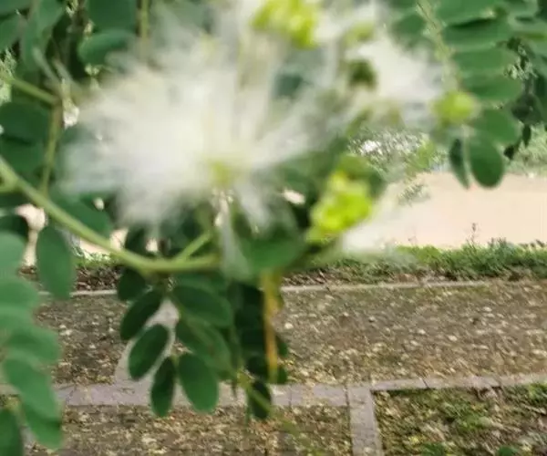 山槐,属中等乔木,通常高3-8米。枝条暗褐色,被短柔毛,有显著皮孔。二回羽状复叶,有羽片2-4对,小叶先端圆钝而有细尖头,两面均被短柔毛,中脉稍偏于上侧。花白色,花冠密生短柔毛。荚果扁平,深褐色,疏生短柔毛。花期6-7月,果熟期8-9月。 [1-2]