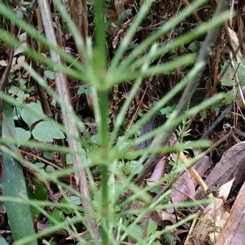 木贼(学名:Equisetum hyemale L.),别称:千峰草、锉草、笔头草、笔筒草、接骨草、马人参等。多年生常绿草本,高30-100厘米。根状茎粗短,黑褐色,横生地下,节上生黑褐色的根。地睛茎直立,单一或仅于基部分枝,直径6-8毫米,中空,有节,表面灰绿色或黄绿色,有纵棱沟壑0-30条,粗糙。