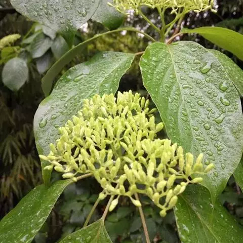 头状花序近球形,生于小枝顶端,具20-30朵花;花序总苞片4枚,长达5厘米,花瓣状,卵形或卵状披针形,乳白色。花萼筒状;花盘垫状。雄蕊4,子房2室。果球形,紫红色;总果柄纤细,长5.5-6.5厘米,果实直径1.5-2.5厘米。花期5-6月,果期8-10月。