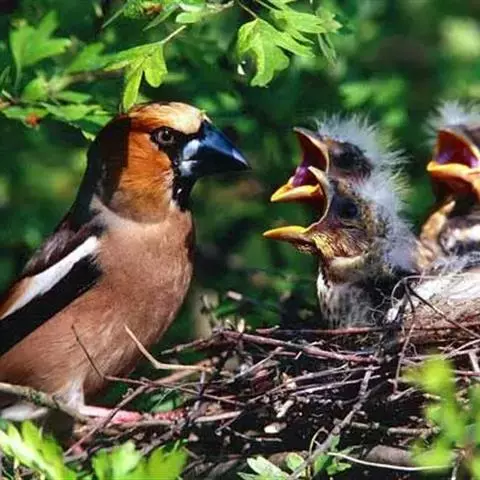 雌交嘴雀每次产卵3-4枚,它从产下第1枚卵起,就在巢内孵卵,一直到鸟宝宝离巢为止。
