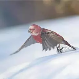 红腰朱雀:体长12-14厘米,小型鸟类。雄鸟前额和眉纹玫瑰粉红色,头顶和一宽的贯眼带深红褐色,背红…