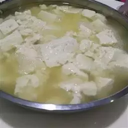 9、把日本豆腐放进去,翻动时要小心不要用铲子把豆腐弄破;