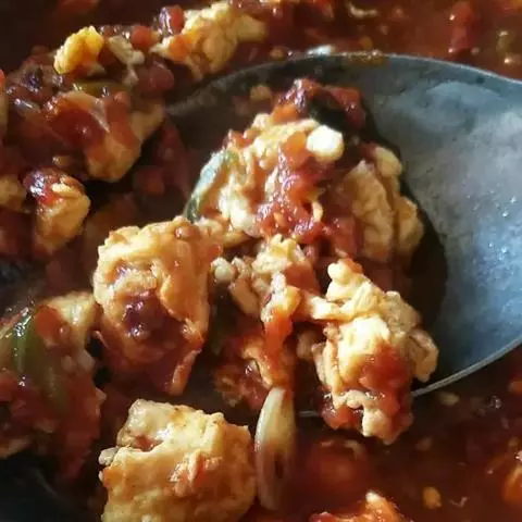4、锅内余少许油,把肉末倒入翻炒变色,再下姜蒜爆香,把青椒、香菇和圣女果倒入略炒。放入盐和生抽,把豆腐、肉末和鸡蛋碎依次倒入,小心翻炒,用鸡精调味。最后勾芡、滴入麻油即可。