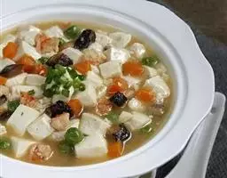 主料:豆腐 400克 辅料:虾仁 150克 毛豆 50克