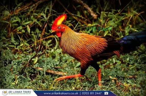 黑尾原鸡(学名:Gallus lafayetii):雄鸟体型较大,体羽艳丽且金属光泽;脸部裸皮、有红色肉冠及肉垂,大而显著;中央两枚尾羽延长,下垂如镰刀状。雌性较小,体色单一,羽毛呈深褐色,下颈部及胸部有一些白斑。