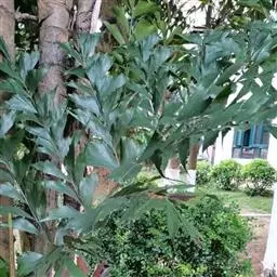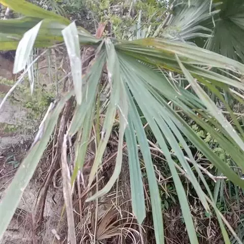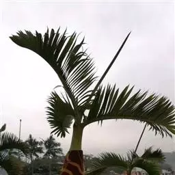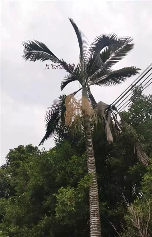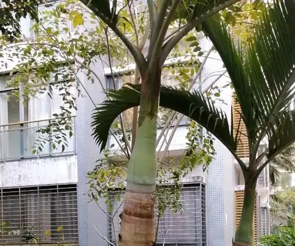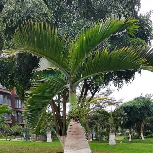 假槟榔 乔木状,高达10-25米,茎粗约15厘米,圆柱状,基部略膨大。叶羽状全裂,生于茎顶,长2-3米,羽片呈2列排列,线状披针形,长达45厘米,宽1.2-2.5厘米,先端渐尖,全缘或有缺刻,叶面绿色,叶背面被灰白色鳞秕状物,中脉明显;叶轴和叶柄厚而宽,无毛或稍被鳞秕;叶鞘绿色,膨大而包茎,形成明显的冠茎。