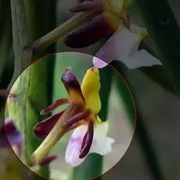 总花梗腋生,长3-5厘米,疏生深褐色腺毛;花3-9朵,排成总状花序;花梗细,基部有1条形苞片;花小,黄色或淡紫色;侧生萼片2,卵形,先端突尖;旗瓣圆形,背面中肋有龙骨突,先端有短喙;翼瓣有柄,2裂,基部裂片近卵形,先端尖,上部裂片较大,斜卵形,尖;唇瓣漏斗状,基部突然延长成螺旋状卷曲的长距;花药钝。