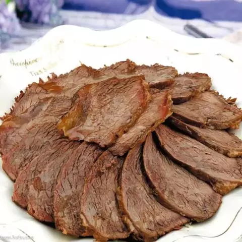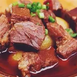 5.把炸好的肉片放到烧沸的卤汁里煮,煮熟为止。喜欢吃烂一点的朋友可增加时间。卤汁的佐料有姜片、大葱、花椒、八角、小茴香、香沙、桂皮、良姜等。卤汁的作法:将炒锅烧热,倒入食用油把油烧热放入切好的姜片、大葱、花椒、八角用热油炝一下然后将腌制肉片剩下的酱汁倒入锅里熬一下(如果剩下的酱汁不够用可继续添加老抽和白糖),沸腾后加入适量的水和香沙、桂皮、良姜等佐料将卤汁烧热后就可以放入炸好的肉片煮熟了。