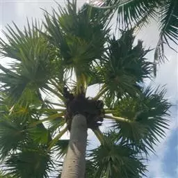 蒲葵 剥棕摘叶的时间都在移栽、定植的月份进行。因为在这段时间内,植株从小就受到播种、移栽、定植的锻炼,可以避免因剥棕(苞片)受到伤害而死亡。第一次剥棕要在定植后5年进行,这样形成的主干粗壮,剥早了容易造成主干上大下小。每一次剥棕都必须留第三年的叶片不剥,如果留得太少,伤其心,植株必定死亡。如果没有剥棕,对枯黄的叶片及时将贴苞片割掉,使植株一年四季都呈现出青翠的热带风光,南国景色。