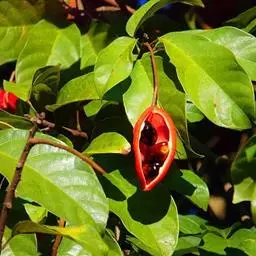 榴莲 常绿乔木,高可达25米,幼枝顶部有鳞片。托叶长1.5-2厘米,叶片长圆形,有时倒卵状长圆形,短渐尖或急渐尖,基部圆形或钝,两面发亮,上面光滑,背面有贴生鳞片,侧脉10-12对,长10-15厘米,宽3-5厘米;叶柄长1.5-2.8厘米,聚伞花序细长下垂,簇生于茎上或大枝上,每序有花3-30朵;花蕾球形;花梗被鳞片,长2-4厘米。