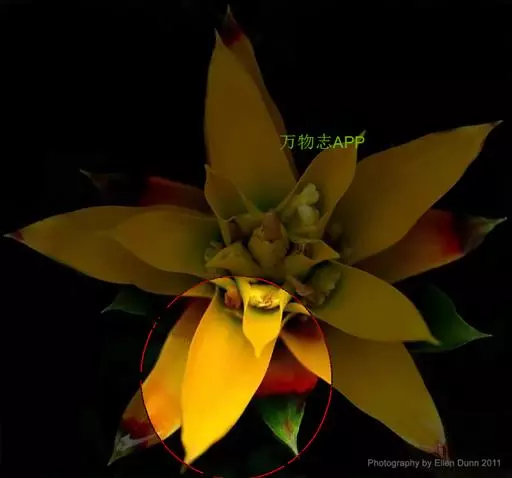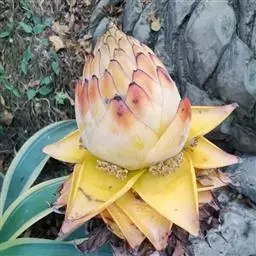 花序直立,直接生于假茎上,密集如球穗状,长20-25厘米,苞片干膜质,黄色或淡黄色,有花2列,每列4-5花;合生花被片卵状长圆形,先端具5 (3+2) 齿裂,离生花被片先端微凹,凹陷处具短尖头。