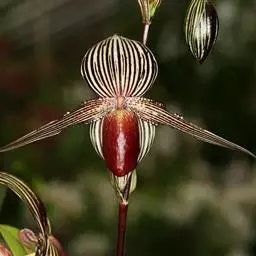 花序侧生于茎的基部,长达50厘米,不分枝或有时分枝;花序柄绿色,粗4-5毫米,被数枚鳞片状鞘;花序轴紫绿色,多少回折状,常具数朵由基部向顶端逐朵开放的花;花苞片卵状三角形,长3-5毫米;花梗连同子房绿色,纤细,长2.5-4.5厘米;花白色,美丽,花期长;中萼片近椭圆形,长2.5-3厘米,宽1.4-1.7厘米,先端钝,基部稍收狭,具网状脉;侧萼片歪卵形,长2.6-3.5厘米,宽1.4-2.2厘米,先端钝,基部收狭并贴生在蕊柱足上,具网状脉;花瓣菱状圆形,长2.7-3.4厘米,宽2.4-3.8厘米,先端圆形,基部收狭呈短爪,具网状脉;唇瓣3裂,基部具长约7-9毫米的爪;侧裂片直立,倒卵形,长2厘米,先端圆形或锐尖,基部收狭,具红色斑点或细条纹,在两侧裂片之间和中裂片基部相交处具1枚黄色肉突;中裂片似菱形,长1.5-2.8厘米,宽1.4-1.7厘米,先端渐狭并且具2条长8-18毫米的卷须,基部楔形;蕊柱粗壮,长约1厘米,具宽的蕊柱足;花粉团2个,近球形,每个劈裂为不等大的2爿。花期4-6月。
