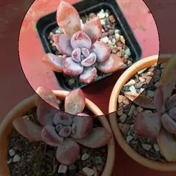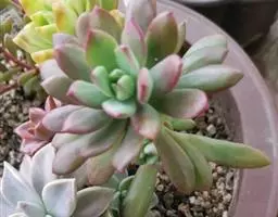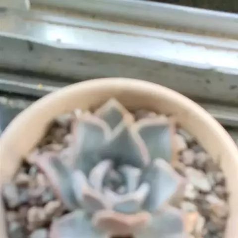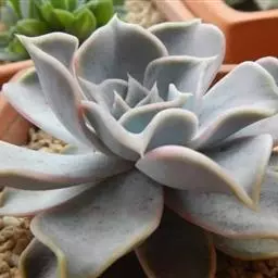 吉玛利亚,中小型品种,植株莲座型紧密排列,叶肥厚倒卵形,叶尖急尖,略披薄粉,叶色粉青到粉蓝,叶尖叶缘易变红,出状态时植株粉嫩, 叶缘叶背多出变红。