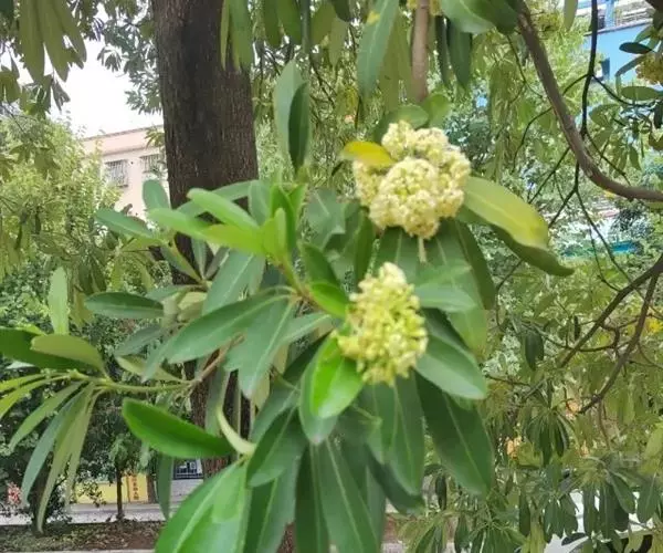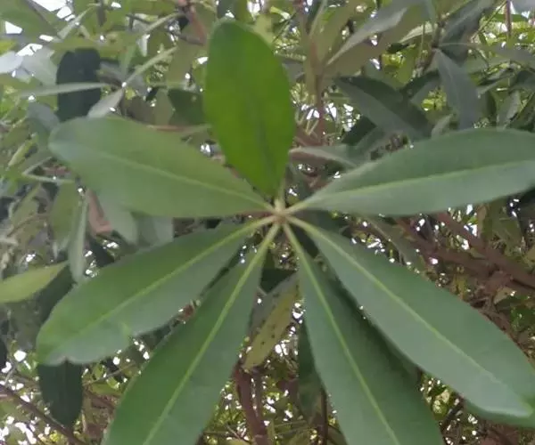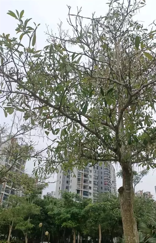 糖胶树(学名:Alstonia scholaris (L.)R. Br.),又称“象皮树”“灯架树”“黑板树”等,是夹竹桃科,鸡骨常山属乔木。高达20m,枝轮生,具乳汁,无毛;叶轮生,倒卵状长圆形、倒披针形或匙形,稀椭圆形或长圆形;花白色,多朵组成稠密的聚伞花序,顶生,被柔毛;蓇葖细长,线形,种子长圆形,花期6-11月,果期10月-翌年4月。