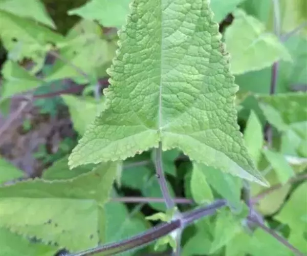 叶片三角形或卵圆状三角形,长3-16厘米,宽2.3-16厘米,先端渐尖或尾状渐尖,基部心形或戟形,间有近截形,基片卵圆形,先端锐尖或钝,边缘具重圆齿或牙齿,上面绿色,被长柔毛或短硬毛,下面淡绿色,沿脉被长柔毛,余部散布黄褐色腺点;叶柄长1-9厘米,被疏或密的长柔毛。