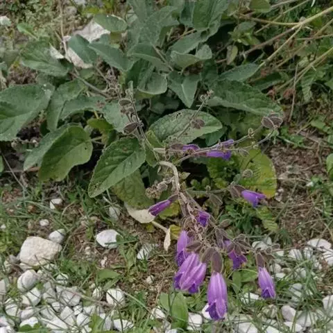 花萼钟形,长7-10毫米,花后稍增大,外被长柔毛,内面被微硬伏毛,二唇形,唇裂至萼长1/3,上唇宽卵状三角形,长约3毫米,宽6毫米,先端有3个聚合的短尖头,下唇比上唇略长,半裂成2齿,齿斜三角形,先端锐尖。花冠蓝紫或紫色,长2.3-2.8厘米,外面略被短柔毛,内面离基部3-3.5毫米有斜向不完全的疏柔毛毛环,冠筒基部狭长,圆筒形,伸出萼外,向上突然膨大,并向上弯曲,呈喇叭状,宽达7毫米,冠檐二唇形,上唇长圆状倒心形,长8毫米,宽6-7毫米,先端微缺,下唇较上唇短而宽,长7毫米,宽达12毫米,3裂,中裂片阔扇形,长4毫米,宽8毫米,侧裂片新月形,宽3毫米。