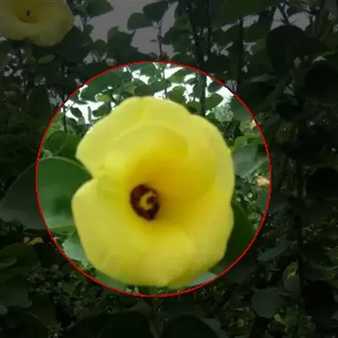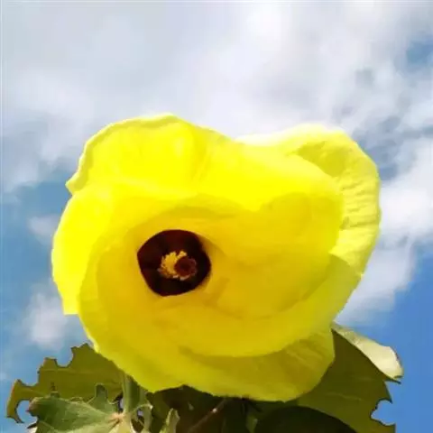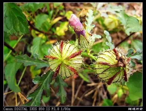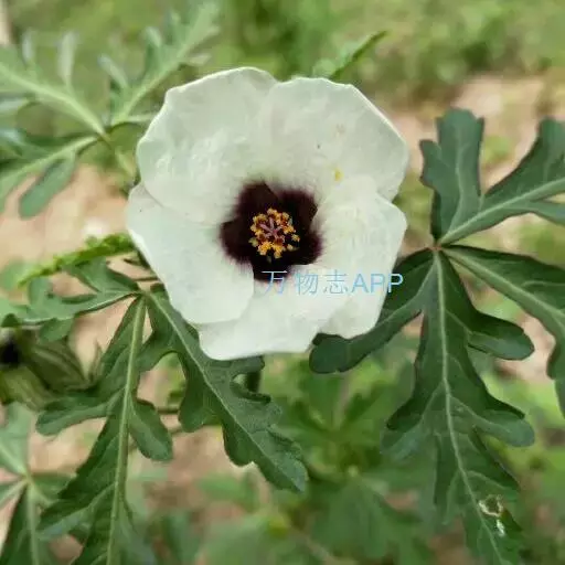 一年生直立或平卧草本,高25-70厘米,茎柔软,被白色星状粗毛。叶二型,下部的叶圆形,不分裂,上部的叶掌状3-5深裂,直径3-6厘米,中裂片较长,两侧裂片较短,裂片倒卵形至长圆形,通常羽状全裂,上面疏被粗硬毛或无毛,下面疏被星状粗刺毛;叶柄长2-4厘米,被星状粗硬毛和星状柔毛;托叶线形,长约7毫米,被星状粗硬毛。花单生于叶腋,花梗长约2.5厘米,果时延长达4厘米,被星状粗硬毛;小苞片12,线形,长约8毫米,被粗长硬毛,基部合生;花萼钟形,淡绿色,长1.5-2厘米,被粗长硬毛或星状粗长硬毛,裂片5,膜质,三角形,具纵向紫色条纹,中部以上合生;花淡黄色,内面基部紫色,直径2-3厘米,花瓣5,倒卵形,长约2厘米,外面疏被极细柔毛;雄蕊柱长约5毫米,花丝纤细,长约3毫米,花药黄色;花柱枝5,无毛。蒴果长圆状球形,直径约1厘米,被粗硬毛,果爿5,果皮薄,黑色;种子肾形,黑色,具腺状突起。花期7-10月。
