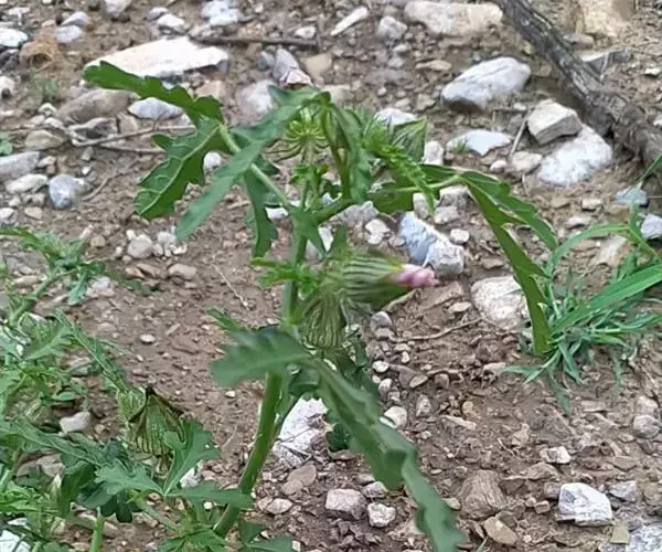 本品茎柔软,长30-60cm。表面具星状粗毛。单叶互生,叶柄长2-4cm;完整叶片掌状3-5全裂,直径3-6cm,裂片倒卵形,通常羽状分裂,两面有星状粗刺毛。质脆。气微,味甘淡。