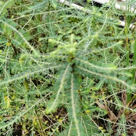 一年生草本植物,高数寸至尺许。茎带紫红色,有纵棱。叶互生,作复瓦状排列,形成二行,很似羽状复叶,叶片矩圆形,长二、三分,全绿,先端尖或钝,基部圆形,几无叶柄。夏秋沿茎叶下面开白色小花,无花柄。花后结扁圆形小果,形如小珠,排列于假复叶下面。